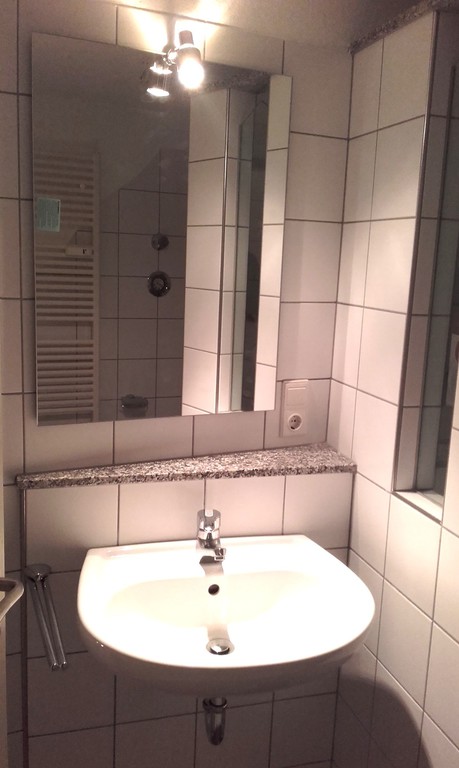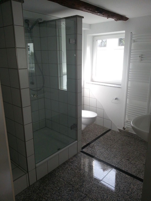 Die Bodenfliesen im Bad sind aus Naturstein, der Rest der Wohnung ist komplett gefliest.